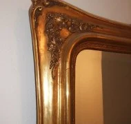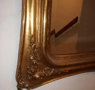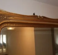 Rama pentru oglindă originală, completată prin adaosuri de lemn la exterior, pentru extinderea lățimii și îmbogățită cu ornamente noi.